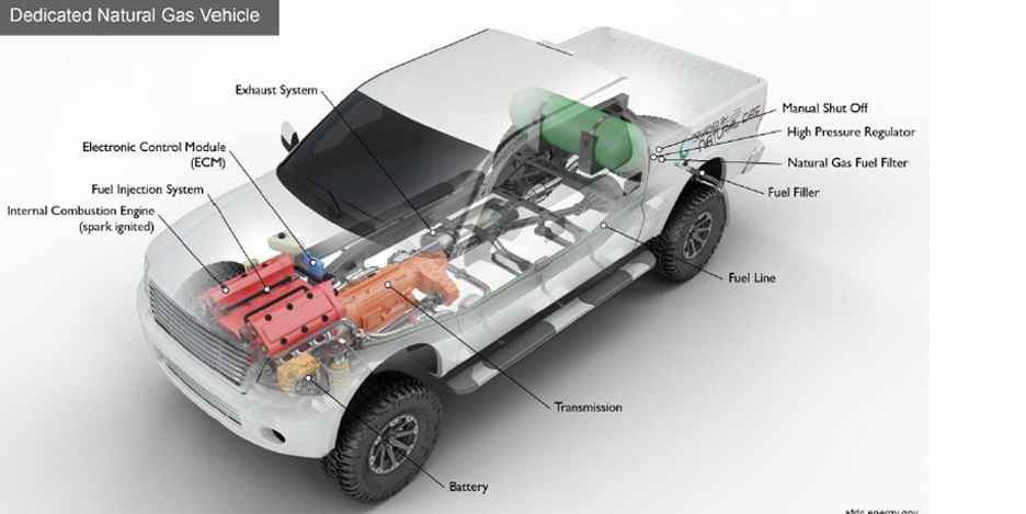 CNG vehicles work much like Petrol vehicles with spark ignited internal combustion engine. The engine functions the same way as a Petrol engine. The fuel-air mixture is compressed and ignited by a spark plug. CNG is stored in a cylinder at the back of the vehicle. A CNG fuel system transfers CNG from the cylinder to engine where its pressure is reduced to a level compatible with the engine fuel injection system, through which the fuel is introduced into the intake manifold or combustion chamber.